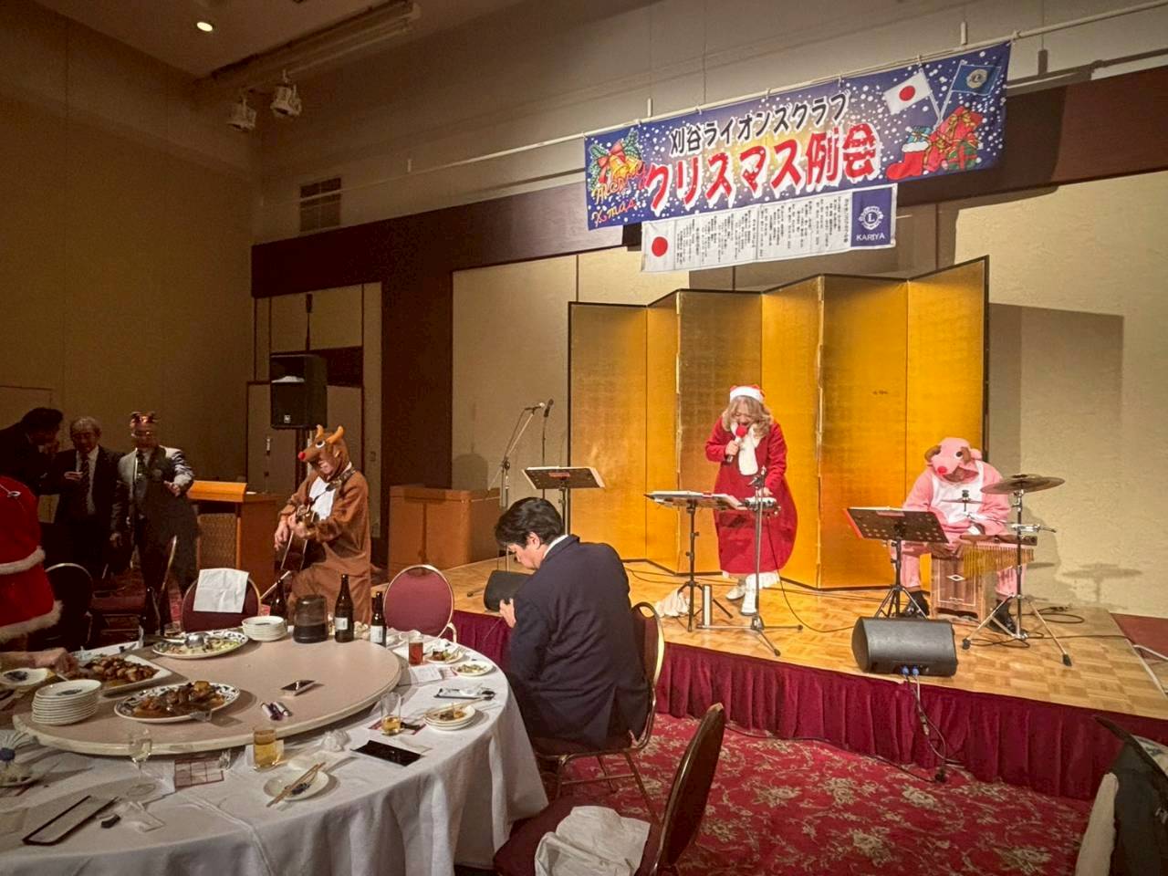 今年最後の例会にレディー、ご家族を含め73名の参加での開催。アトラクションではカリヤーズによるライブ演奏、記入式のお名前ビンゴで新しい交流ができました。